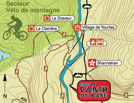 Car si le nom Camp de Base le désigne comme le lieu de rassemblement le plus près des activités, vous serez étonné de constater qu’une courte marche vous permet d’accéder à la mise à l’eau pour la descente en canot, au vaste réseau de sentiers de randonnée pédestre et aux nombreuses pistes de vélo de montage. De plus, son accès en voiture vous permettra tous les ravitaillements nécessaires aux expéditions de votre équipe d’aventuriers !